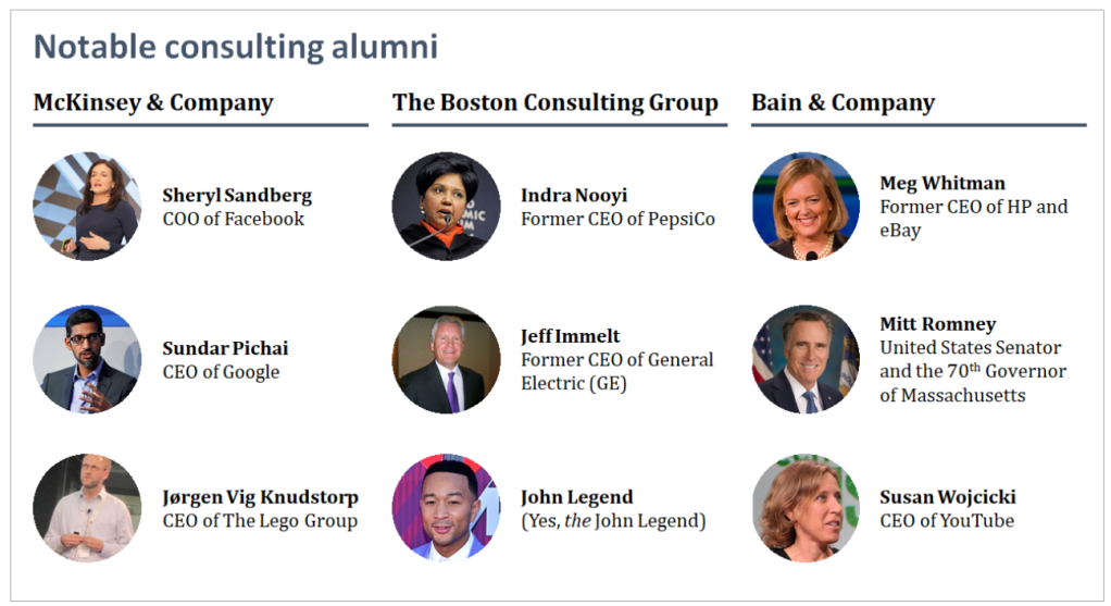 “McKinsey, BCG, Bain, Top 5 Alumni | A Taste Of What Consulting Can Do.” Management Consulted, 2 July 2021, https://managementconsulted.com/mckinsey-bcg-bain-top-5-alumni/. Accessed 30 May 2023.