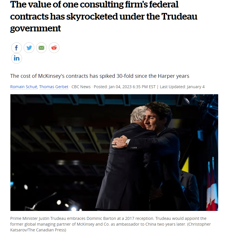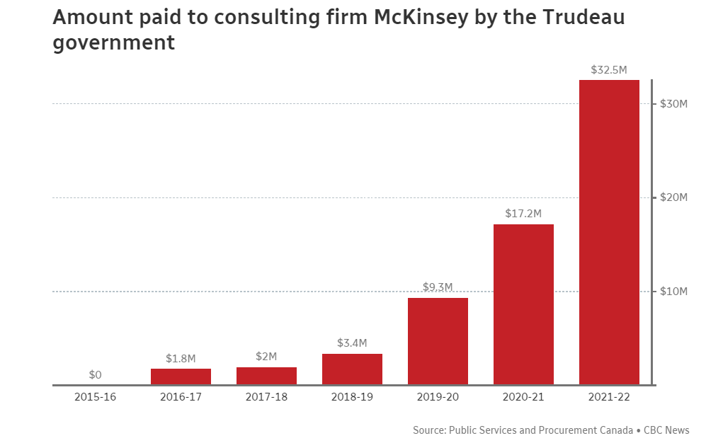 According to the CBC during the last 7 years of Trudeau’s run in office his government has spent $66 million CAD in consulting fees to McKinsey. CBC goes as far as to quote sources within the government saying: