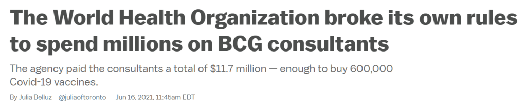 Belluz, Julia. “WHO improperly spent millions on BCG management consultants, audit says.” Vox, 16 June 2021, https://www.vox.com/2021/6/16/22527665/world-health-organization-who-12-million-bcg-consultants. Accessed 30 May 2023.