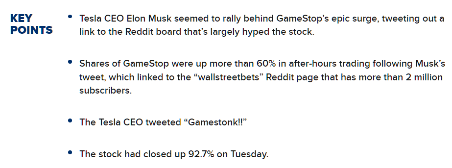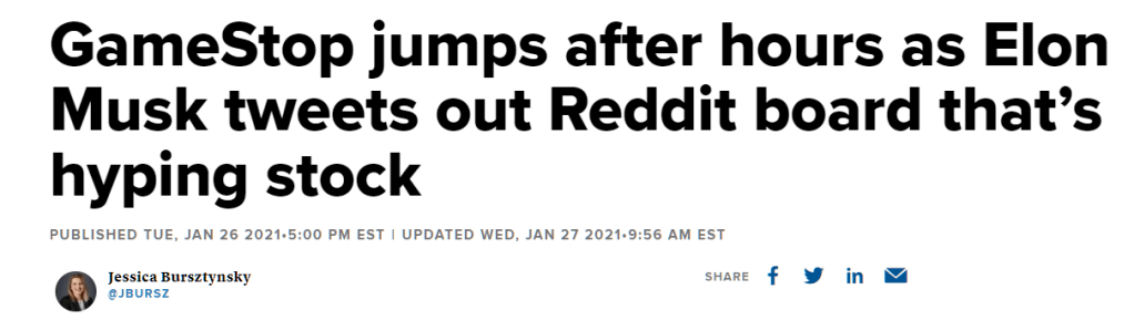 “GameStop jumps as Elon Musk tweets out Reddit board that’s hyping stock.” CNBC, 26 January 2021, https://www.cnbc.com/2021/01/26/gamestop-jumps-as-elon-musk-tweets-out-reddit-board-thats-hyping-stock.html. Accessed 30 May 2023.