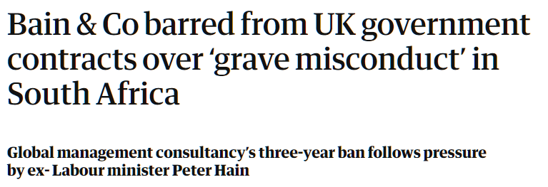 Kollewe, Julia. “Bain & Co barred from UK government contracts over ‘grave misconduct’ in South Africa.” The Guardian, 3 August 2022, https://www.theguardian.com/business/2022/aug/03/bain-and-co-barred-from-uk-government-contracts-over-grave-misconduct-in-south-africa. Accessed 31 May 2023.