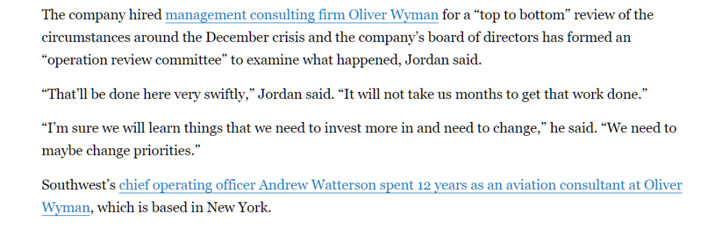 As their public image being Southwest Airlines has always been pretty touch and go, this disruption could have dealt the final blow to the airline. So what does any struggling corporation do when in crisis? Call in the consultants of course!