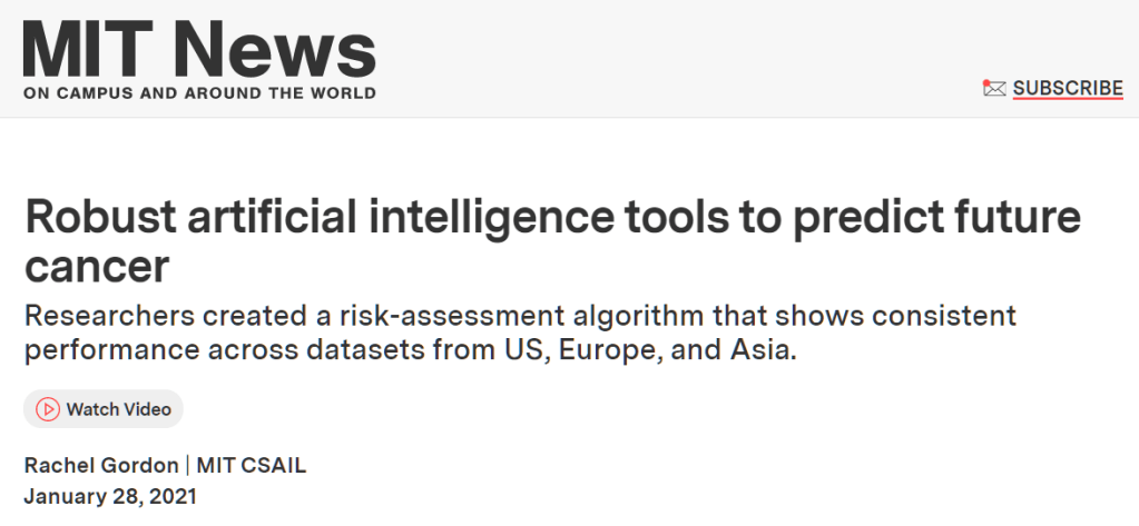 Gordon, Rachel. “Robust artificial intelligence tools to predict future cancer.” MIT News, 28 January 2021, https://news.mit.edu/2021/robust-artificial-intelligence-tools-predict-future-cancer-0128. Accessed 31 May 2023.