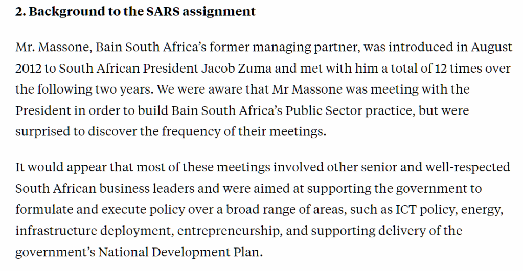 It started when South African President Jacob Zuma called upon Bain during a time of civic change in his country. Zuma is known to be a shady dude having been tried for many things including corruption and rape as early as 2006, but was/is a populist President who made great fanfare of his influence and changes to South Africa. His party embarked on large scale transformation projects incurring millions of dollars in contracts for public works and other social initiatives during his tenure. Zuma being of a growth oriented mindset and wanting to globally expand, looked to the global markets.