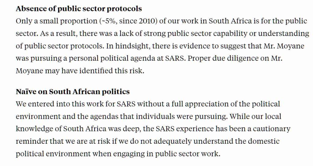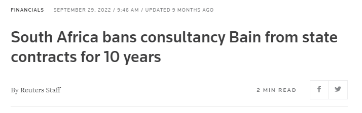 We’ll get more into shady dealings in the following but as a teaser just last year Bain and Co. was banned from the entire country of South Africa due to ‘misconduct’ with former President Jacob Zuma.