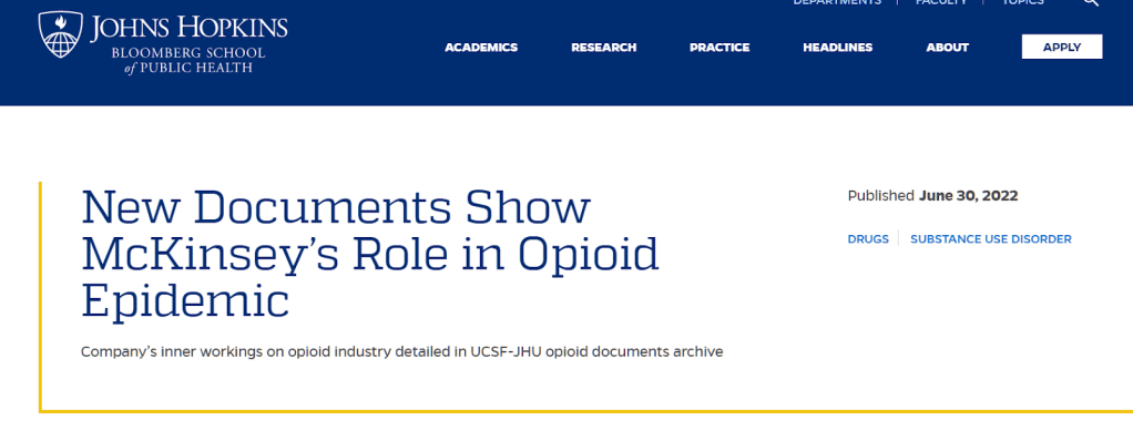 “New Documents Show McKinsey’s Role in Opioid Epidemic | Johns Hopkins | Bloomberg School of Public Health.” Johns Hopkins Bloomberg School of Public Health, 30 June 2022, https://publichealth.jhu.edu/2022/new-documents-show-mckinseys-role-in-opioid-epidemic. Accessed 30 May 2023.