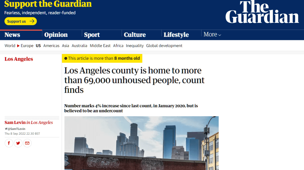 Levin, Sam. “Los Angeles county is home to more than 69000 unhoused people, count finds.” The Guardian, 8 September 2022, https://www.theguardian.com/us-news/2022/sep/08/los-angeles-homelessness-unhoused-people-number. Accessed 31 May 2023.
