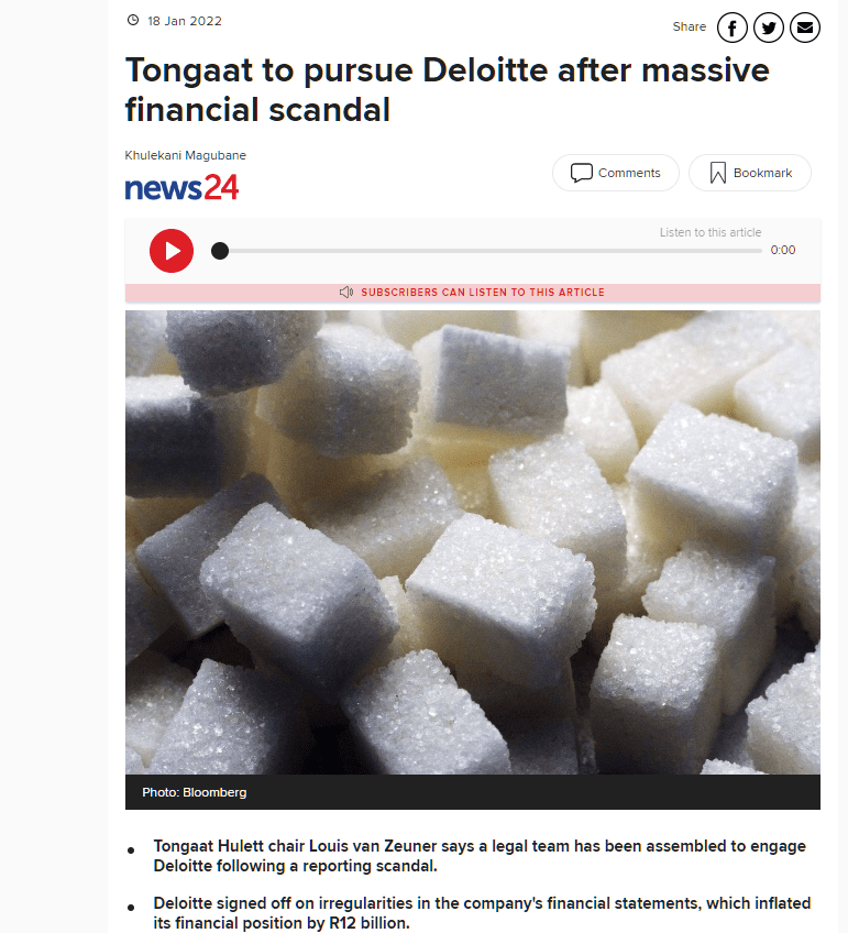 Wilson, Nick. “Tongaat to pursue Deloitte after massive financial scandal | Business.” News24, 18 January 2022, https://www.news24.com/fin24/Companies/tongaat-to-pursue-deloitte-after-massive-financial-scandal-20220118. Accessed 30 May 2023.
