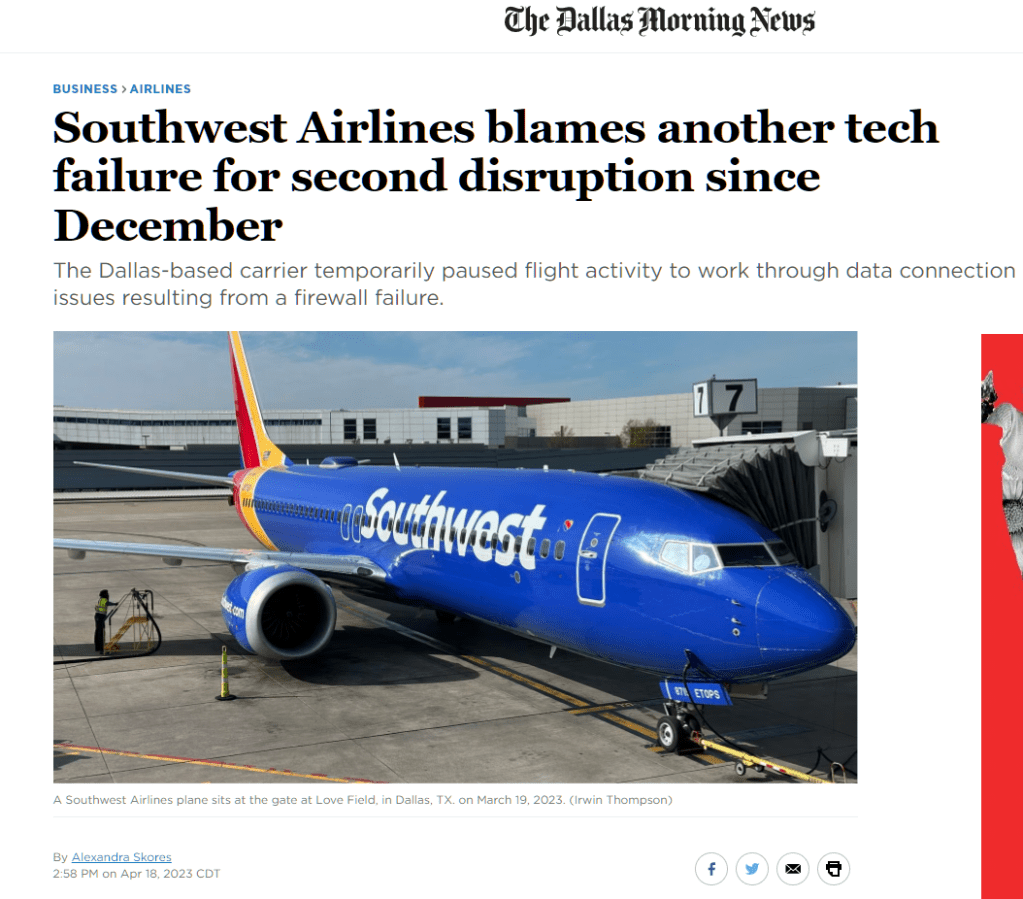 Skores, Alexandra. “Southwest Airlines blames another tech failure for second disruption since December.” The Dallas Morning News, 18 April 2023, https://www.dallasnews.com/business/airlines/2023/04/18/southwest-airlines-blames-another-tech-failure-for-second-disruption-since-december/. Accessed 31 May 2023.
