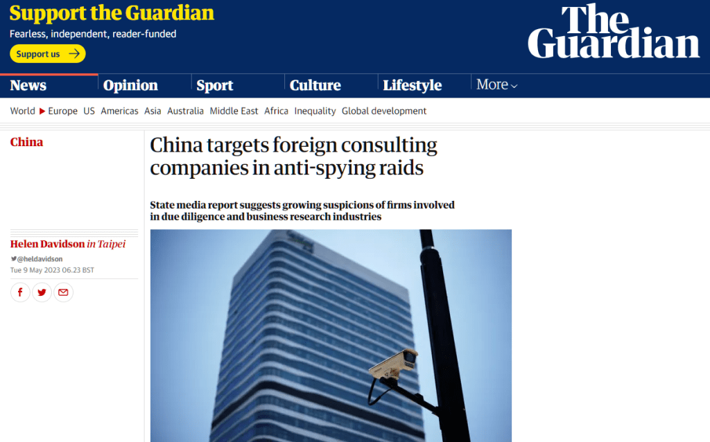 Davidson, Helen. “China targets foreign consulting companies in anti-spying raids.” The Guardian, 9 May 2023, https://www.theguardian.com/world/2023/may/09/china-targets-foreign-consulting-companies-in-anti-spying-raids. Accessed 31 May 2023.