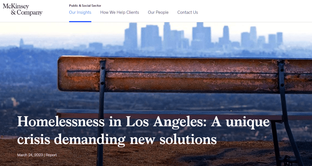 “Finding solutions to Los Angeles’ homelessness crisis.” McKinsey, 24 March 2023, https://www.mckinsey.com/industries/public-and-social-sector/our-insights/homelessness-in-los-angeles-a-unique-crisis-demanding-new-solutions. Accessed 31 May 2023.