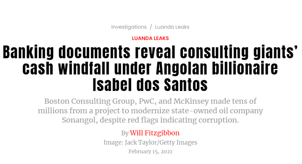 Fitzgibbon, Will, and Jack Taylor. “Banking documents reveal consulting giants’ cash windfall under Angolan billionaire Isabel dos Santos.” ICIJ, 15 February 2021, https://www.icij.org/investigations/luanda-leaks/banking-documents-reveal-consulting-giants-cash-windfall-under-angolan-billionaire-isabel-dos-santos/. Accessed 31 May 2023.