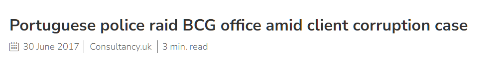 “Portuguese police raid BCG office amid client corruption case.” Consultancy.uk, 30 June 2017, https://www.consultancy.uk/news/13634/portuguese-police-raid-bcg-office-amid-client-corruption-case. Accessed 31 May 2023.