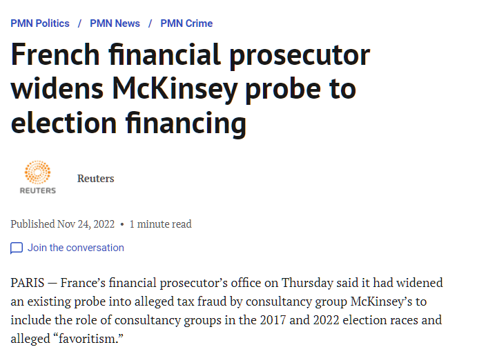 Black, Conrad, et al. “French financial prosecutor widens McKinsey probe to election financing.” National Post, 24 November 2022, https://nationalpost.com/pmn/news-pmn/crime-pmn/french-financial-prosecutor-widens-mckinsey-probe-to-election-financing. Accessed 31 May 2023.