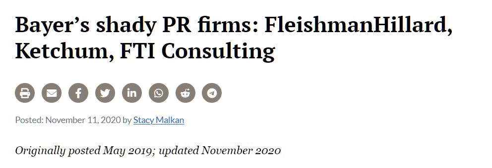 Malkan, Stacy. “Bayer’s shady PR firms: FleishmanHillard, Ketchum, FTI Consulting.” USRTK.org, 11 November 2020, https://usrtk.org/pesticides/bayers-shady-pr-firms-fleishmanhillard-and-ketchum/. Accessed 31 May 2023.