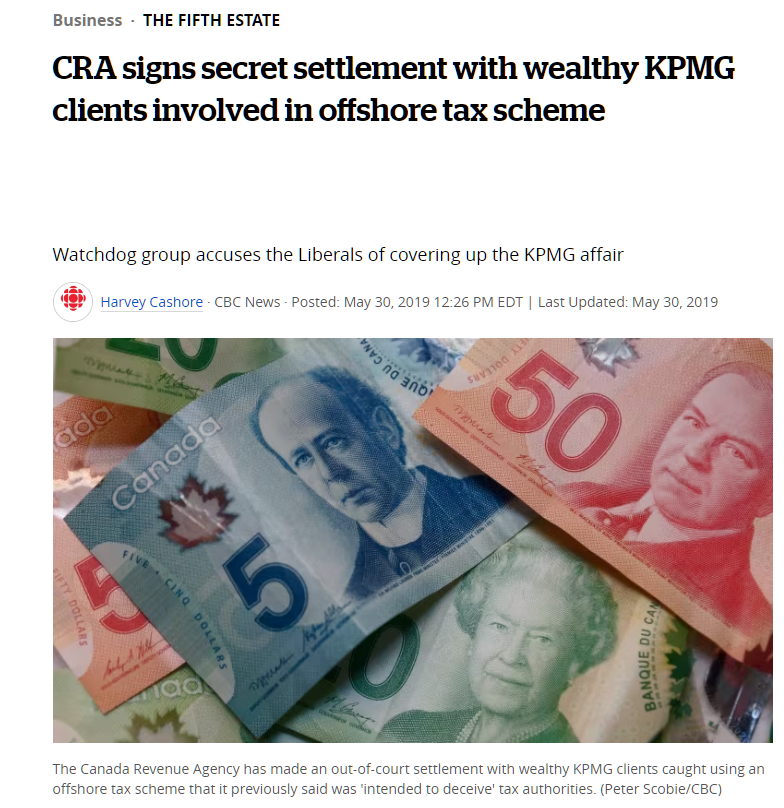 Cashore, Harvey. “CRA signs secret settlement with wealthy KPMG clients involved in offshore tax scheme.” CBC, 30 May 2019, https://www.cbc.ca/news/business/cra-kmpg-settlement-taxes-1.5154610. Accessed 31 May 2023.