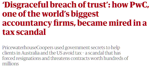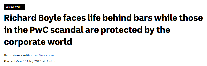 “Richard Boyle faces life behind bars while those in the PwC scandal are protected by the corporate world.” ABC, 15 May 2023, https://www.abc.net.au/news/2023-05-16/pwc-tax-scandal-raises-government-outsourcing-questions/102349266. Accessed 31 May 2023.