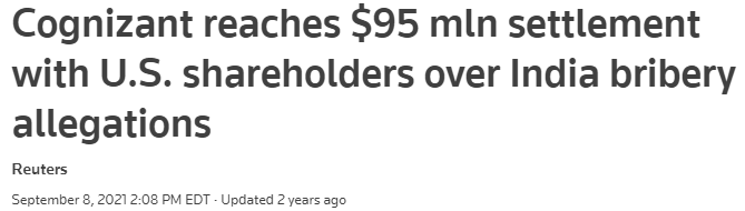 Stempel, Jonathan, and Mark Potter. “Cognizant reaches $95 mln settlement with U.S. shareholders over India bribery allegations.” Reuters, 8 September 2021, https://www.reuters.com/technology/cognizant-reaches-95-mln-settlement-with-us-shareholders-over-india-bribery-2021-09-08/. Accessed 31 May 2023.