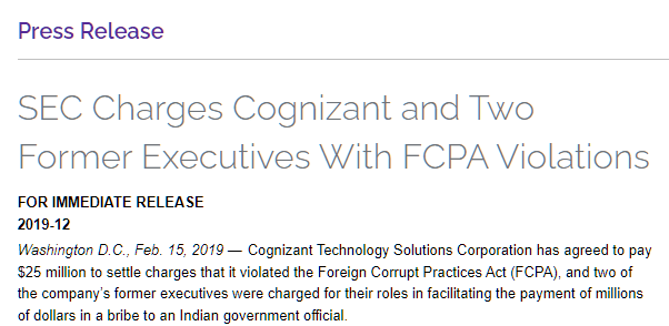 “SEC Charges Cognizant and Two Former Executives With FCPA Violations.” SEC.gov, 15 February 2019, https://www.sec.gov/news/press-release/2019-12. Accessed 31 May 2023.