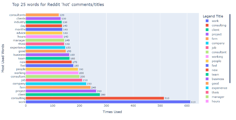I collected all the ‘hot’ posts comments and broke down the language into single words (tokens). I chose not to apply sentiment analysis as I am a very sentimental anglophone human. Once the data was processed, numerically it would seem that they just talk about work and how many hours they’re giving. ‘Consulting’, being ‘consultants’, ‘project’, ‘pay’, ‘travel’. They said the word work over 600 times in a single post. Even online where you do see a sense of freedom in what they’re saying when you compile it all is still just about the grind of the job.