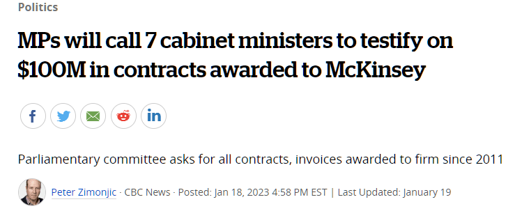 Schué, Romain, and Thomas Gerbet. “The value of one consulting firm’s federal contracts has skyrocketed under the Trudeau government.” CBC, 4 January 2023, https://www.cbc.ca/news/politics/mckinsey-immigration-consulting-contracts-trudeau-1.6703626. Accessed 30 May 2023.