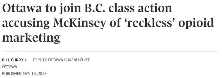 Curry, Bill. “Ottawa to join B.C. class action accusing McKinsey of ‘reckless’ opioid marketing.” The Globe and Mail, 18 May 2023, https://www.theglobeandmail.com/politics/article-ottawa-mckinsey-opioid-marketing/. Accessed 30 May 2023.