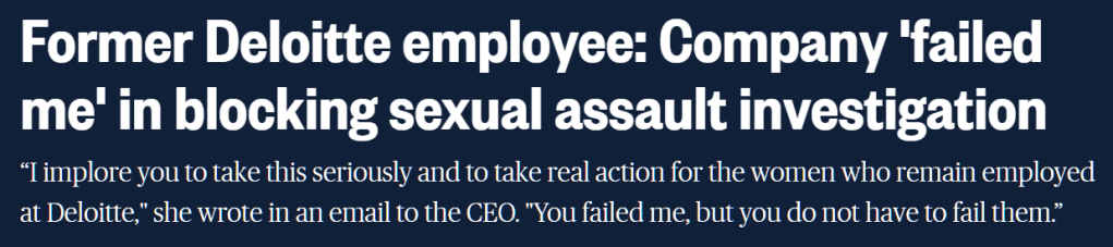 Another big national player here in Canada is Deloitte, who often provide scandalous press fodder though they haven’t had the same funds/contracts as some of the other firms. Even with these shortcomings they’ve made sure to create a top tier hostile working environment for their female employees.