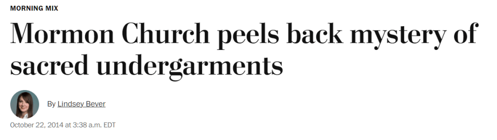 Bever, Lindsey, and Brian Laundrie’s. “Mormon Church peels back mystery of sacred undergarments.” The Washington Post, 22 October 2014, https://www.washingtonpost.com/news/morning-mix/wp/2014/10/22/mormon-church-peels-back-mystery-of-sacred-undergarments/. Accessed 30 May 2023.