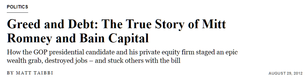 Taibbi, Matt. “The True Story of Mitt Romney and Bain Capital.” Rolling Stone, 29 August 2012, https://www.rollingstone.com/politics/politics-news/greed-and-debt-the-true-story-of-mitt-romney-and-bain-capital-183291/. Accessed 30 May 2023.
