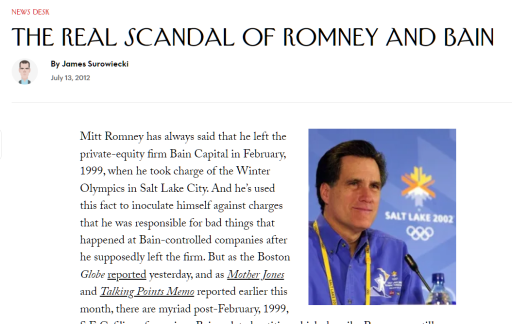 Surowiecki, James. “The Real Scandal of Romney and Bain.” The New Yorker, 13 July 2012, https://www.newyorker.com/news/news-desk/the-real-scandal-of-romney-and-bain. Accessed 30 May 2023.